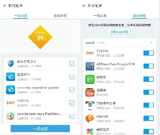 虽然市场上一些其他应用商店也拥有同类功能,但并不能永久禁止应用的自启,过不了多久就会“死灰复燃”。而腾讯应用宝内的“手机加速”功能不仅能“一键加速”释放内存,更能根据自己的使用习惯与喜好,对应用的自启权限进行设置并永久禁止应用自启,轻松实现管理后台自启应用,让手机空间不再随意被占领。