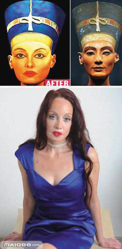 妮琳·纳米塔现年49岁,已经是3个孩子的母亲。据她讲述,在孩提时代和青少年时期,从来没有到过埃及的她却经常做有关这位艳后的梦。23岁时,妮琳在咨询了一名精神分析师后,确信自己就是埃及艳后奈费尔提蒂的转世。于是,自1987年起,妮琳开始走上了整容的漫漫长路。在过去20多年里,妮琳经历了51次整容手术。现在的她和图片中的王后看起来已经非常相似,她自豪的说:“没人相信我已经年近五十了,而且还有3个孩子,我看起来像25岁。”