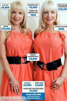 虽然双胞胎乍一看都是一模一样,可仔细观察,还是会发现他们有细微的差异。正所谓“世界上没有两片完全相同的叶子。”但是英国的乔·伯顿和凯瑞·伯顿这对双胞胎就偏偏不满足这99%的相似度,她们的目标就是“百分之百的完美”。是的,她们要看上去绝对的一模一样!于是姐妹俩开始了各种整形,姐妹俩越来越一样,以至于到后来,她们要把自己的名字写在肚子上,才不会让手术医生弄混。现在,34岁的两姐妹都已做过隆胸、隆鼻、刺青、打肉毒杆菌等整形手术,总花费也自然不菲,高达6万英镑。