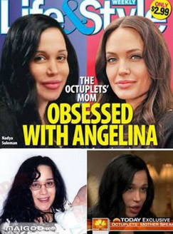刚刚生下八胞胎的美国妈妈,娜德雅·苏尔曼十分崇拜安吉丽娜·茱莉,也自然幻想能够变得和她一样美丽。据她的整形医师说,苏尔曼和茱莉有很多相似之处。比如她们的眉毛几乎一样;都有很漂亮的额头。再经过隆鼻和丰唇,她会更像茱莉。还有巧的是,两人现在都是33岁,还都养育了一大群儿女。但是苏尔曼似乎并不愿意人们说她模仿这位奥斯卡女主角。