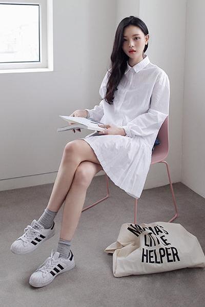 白色长袖衬衫裙,文艺范儿十足的裙装,穿在身上更加清新好看,有种楚楚动人的气质,搭配球鞋,休闲利落,清爽迷人。