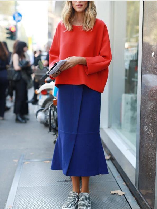 带点黄色调子的橘红色本身就是很显气色的明快色彩,与海军蓝大面积的碰撞也让造型变得既简单又无比丰富。脚上的黑白千鸟格纹一脚蹬不仅调剂平衡了大面积色块的艳丽感,也与宽松舒适的Oversize廓形完美呼应。
