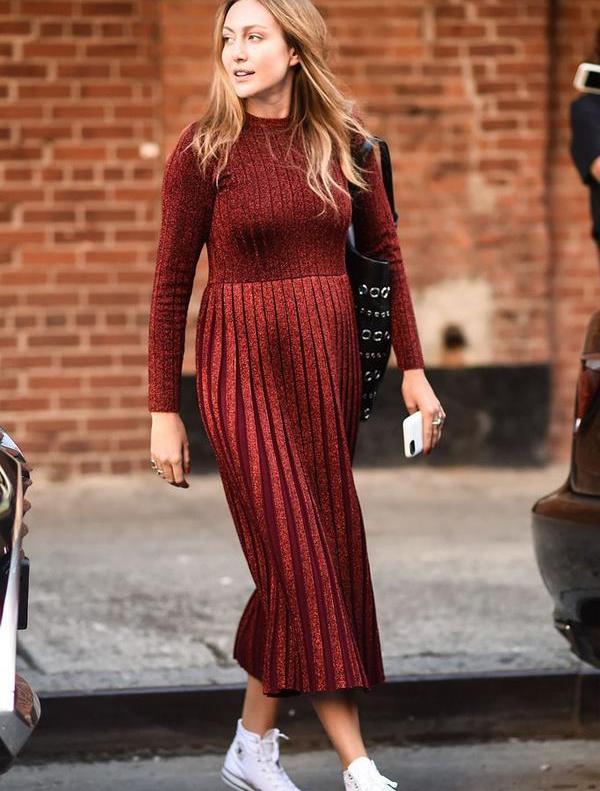 深沉大气的枣红色融入了Bling Bling的金线,加上罗纹和百褶的线条让这件裙装充满了华丽复古感,而脚上的全白高帮帆布鞋则与上面的Look有着异曲同工之妙,将造型一下子变得更加年轻和chic了。
