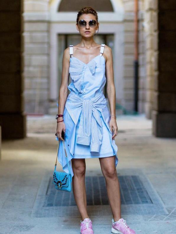 这款吊带连衣裙结合了拼接、不对称、捆绑、斜裁等多种设计手法,将清新的蓝色演绎出十分微妙的少女感氛围,而脚上的粉紫色球鞋则将这种少女味道一下子给提点了出来,贯彻了整体浪漫又迷人的形象。