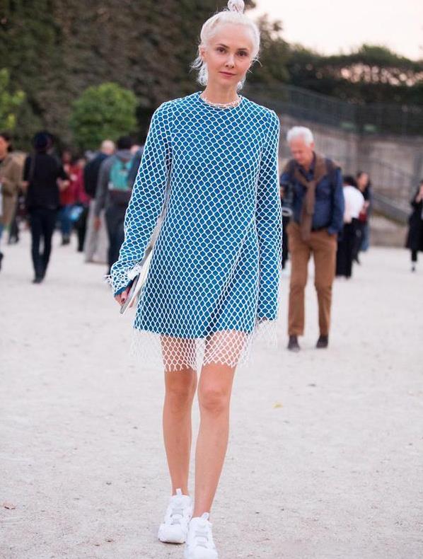 渔网元素不得不说是今年开春的流行大势,时髦精们对渔网袜也都产生了蜜汁狂热。其实除了袜子之外,渔网也可以穿在身上啊!就像这款连衣裙,在白色渔网的里面叠搭钴蓝色的纯色打底,两种颜色的落差和对比让裙子变得十分时髦和吸睛,加之脚上的设计感白球鞋,一扫渔网的魅惑与颓废,变得干净清爽了起来。