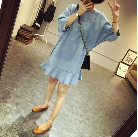 韩国货 牛仔水洗浅蓝色蝙蝠袖廓型宽松显瘦鱼尾中长连衣裙女秋装