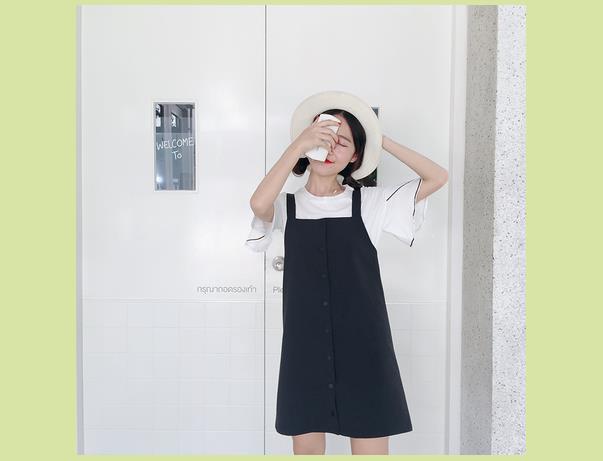 ifashion渔不二又是一个两穿的连衣裙甜美学院风纯色背带裙女