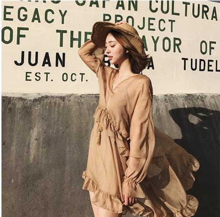 【EC】2017春夏新品 荷叶边绑带喇叭袖宽松中长款套头连衣裙女B27