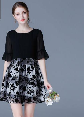 夏装2017新款雪纺连衣裙短袖显瘦时尚拼接印花