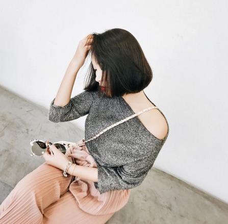 灰常有女人味的一款T恤,一字领的设计展露肩部的精美线条,中袖袖长,浪漫唯美,充满小女生的甜美与优雅,亮丝面料,在阳光下,呈现出blingbling的视觉美感,黑色,银色,宝蓝色3款颜色,可以搭配各种裙装和裤子穿着哦。