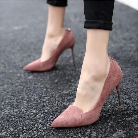 新款黑色尖头高跟鞋细跟性感浅口女鞋绒面百搭单鞋职业鞋