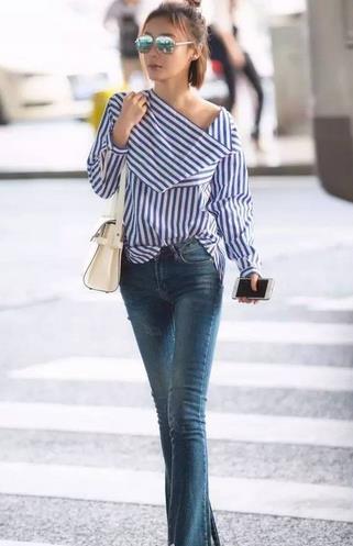 袁姗姗曝光一组街拍LOOK,蓝白条纹不规则衬衫搭牛仔裤和小白鞋的组合随性之中带有一丝俏皮。其荡领立裁设计线条感满满,并巧妙地将天鹅颈小露了一把。整套不规则蓝白条纹LOOK透露出浓浓的法式风,其独特的小个性让时尚效果更加立体多元。