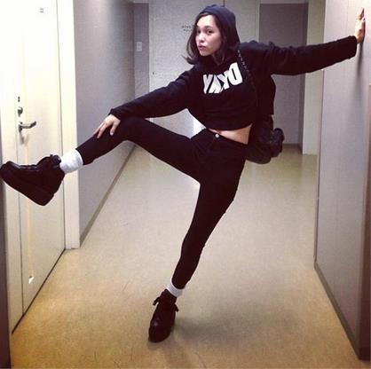 【搭配Tips】 水原希子很喜欢宽松的衣服,尤其是那种上身很繁杂,下面只露一双大长腿的搭配,宽松上衣绝对能够藏起你那平板一样的小身材,而且上衣越繁杂越看不出来哦。