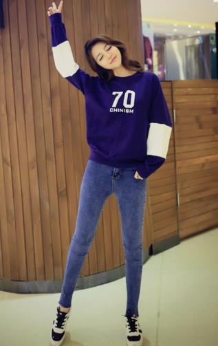 搭配看点:紧身蓝色牛仔裤搭配宽松卫衣,色系上的统一十分耐看,上宽下窄的穿衣方法也十分显瘦,十分适合夏末初秋。