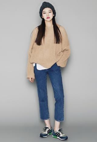 搭配看点:极简的七分牛仔裤搭配杏色毛衣显得十分个性有范,内搭一件白衬衫,增加层次感也提亮了造型色彩,喜欢韩范的菇凉可以学起来噢。