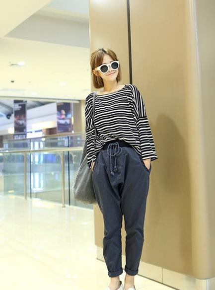 黑白条纹长袖T恤,是早秋季节最流行的上衣,相信很多女生都会喜欢这一件,搭配休闲款式的哈伦裤,白色平底鞋,休闲包包,轻松穿出舒服利落的时尚感。