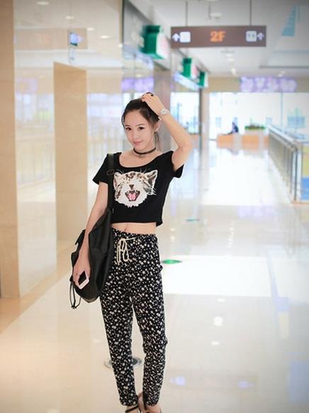 动物图案黑色短袖上衣,还是露脐装的设计,是不是更加有个性呢?搭配碎花哈伦裤,抽绳款式,休闲风格,穿在身上舒适有型。