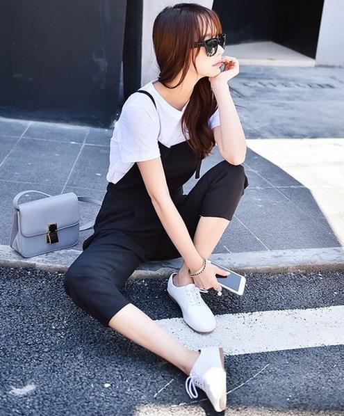 背带裤也有很多种,所以要根据背带裤的实际情况来决定最终怎么穿。想性感一些没问题,但一定要保证是在不走光的前提下才可以。把千篇一律的T恤拿掉,换成黑色的短背心,故意露一部分的小蛮腰,也还是挺有吸引力的。