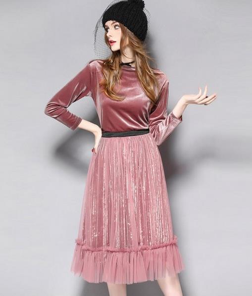 一字领丝绒百褶连衣裙