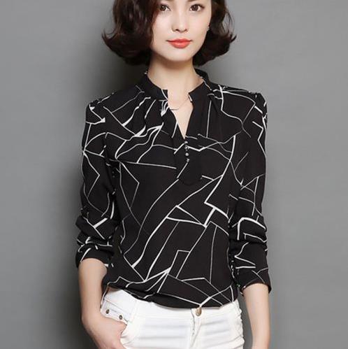 2017春夏显瘦格子印花衬衫女装V领雪纺衫长袖宽松上衣职业装衬衣
