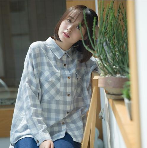 文艺范春季韩版宽松长袖格子衬衫女生百搭小清新轻薄棉上衣新款