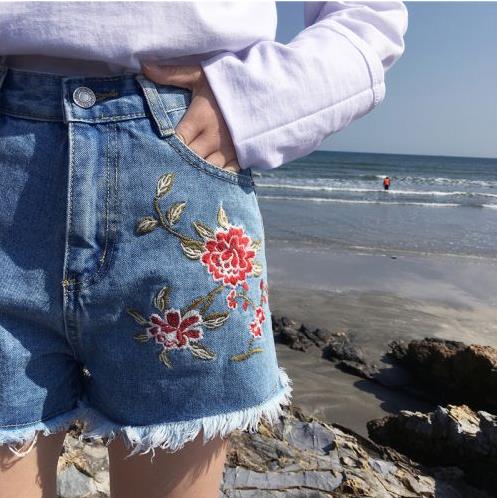 夏季韩版新款高腰少女牛仔短裤小清新刺绣学生修身显瘦A字裤