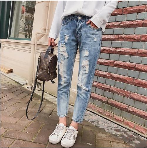 2017新款女装韩版时尚水洗磨白破洞九分牛仔裤显瘦浅色裤子女潮
