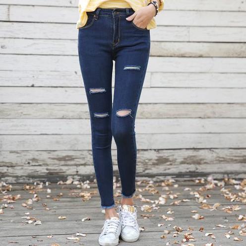 新品韩国深蓝色破洞牛仔裤女磨破裤脚九分裤毛边裤脚小脚铅笔裤