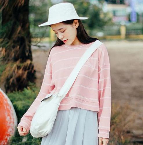 日系文艺长袖条纹T恤 女小短款宽松纯棉T 粉色上衣
