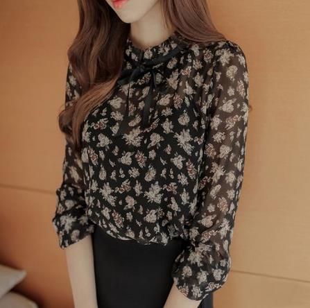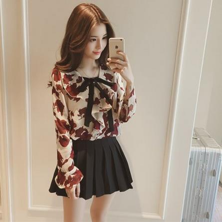 韩版设计的碎花雪纺衫,时尚立领设计,搭配甜美的丝带蝴蝶结,简直就是甜美性感同在,更是尽显淑女优雅风。高腰款式,长度正好到臀部,搭配白色短裤,这样穿会造成下衣失踪的效果,性感指数翻倍哦,百搭黑色雪纺印花清新唯美,让人倍感凉爽。