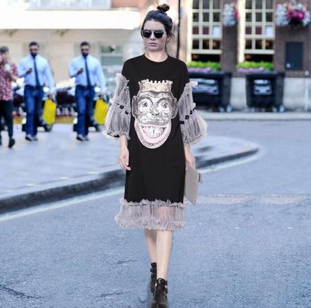 H版型能遮住身上多余的肉肉,完全不挑身材,胸前亮片缝制的卡通造型,生动形象栩栩如生,每一片都是手工缝制的呢,彰显衣服的大气,袖口和群下摆的撞色网纱拼接,甜美俏皮,上身个性又减龄哦。