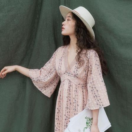 文艺复古V领印花蕾丝收腰碎花喇叭袖连衣裙 显瘦长裙