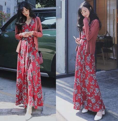 身材微胖匀称的女孩穿起这款套装一定很好看,红色的交叠V领设计性感又修饰颈部线条,加上收腰的设计更是显腰型,长长的裙摆让你完全不用担心赘肉,加上一款砖红色针织开衫,显瘦又不失时尚感。
