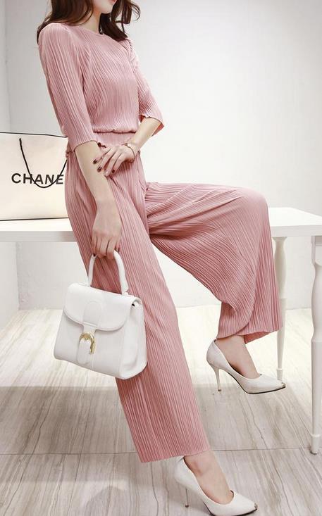樱花粉啊樱花粉,我毕生最爱,没有之一,因为这个颜色既有少女情怀,又不会显得轻佻,所以设计师在设计的时候很能了解大家心理呢,全身百褶设计,遮肉神器啊,而且百褶款,走路的时候回更动感,阔腿裤和5分袖全全都是为了显瘦而设计的,配上白色高跟鞋和同色系包包,搭配银色流苏耳环,画面太美,不敢看!