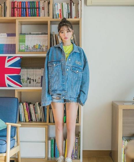 Oversize的韩版牛仔外套搭配牛仔短裤,上宽下窄的廓形不仅为你打造大长腿,而且更是显瘦。少女风带有些许小性感。