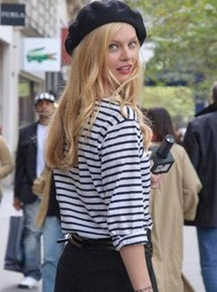 典的藏蓝白横条纹保留着每个女生的水手梦。搭配高腰黑色短裤,时尚有活力,在大波浪长发上加一顶黑色贝雷帽,复古气息中又不失你本来就拥有的青春与朝气。