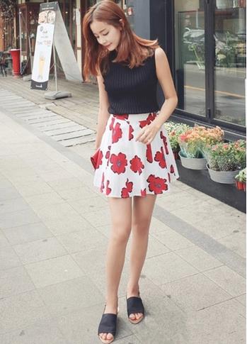 搭配看点:碎花裙子搭配黑色无袖上衣,性感又气场十足,鞋子也选择黑色,呼应上衣色彩让造型更加统一和精致。