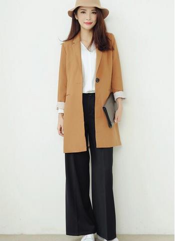 推荐搭配:修身显瘦长款西装外套外穿,内搭白色雪纺衫+阔腿大喇叭裤,简约大方的长款西装外套,修身的版型修饰MM的身材,搭配上阔腿大喇叭裤子,时尚气质又还有点气场~