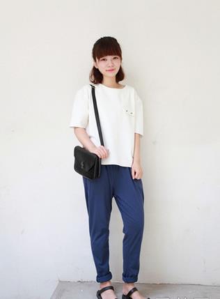 白色短袖T恤,宽松版型最百搭,透着慵懒随性的时尚味道,搭配蓝色卷边哈伦裤,黑色厚底凉鞋,黑色单肩包,大方时髦的装扮,简单好看。