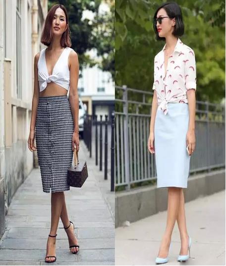 提高腰线的方式有很多种,比如说衣服打结就是一个很不错的选择,澳大利亚时尚博主特别钟爱这种显高方式,无论是性感的短上衣还是知性的衬衫,随意打个结就成为了上半身的焦点,很明显的分割了上半身与下半身。当然,搭高腰直筒半身裙和高跟鞋才让下半身腿部比例更拉长。