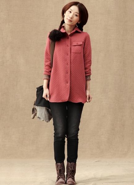 这种胭粉色实在是太迷人了,它会让你散发女人味,即使你是个很中性的女孩。这是有一定厚度的面料,呈菱形,挺括、妥帖又不易起皱,你还可以在秋天拿它做开衫。整个的版型不落俗套,极显特色。