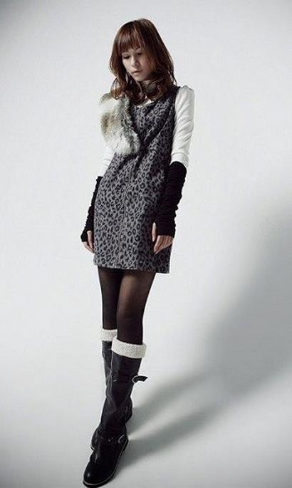 灰紫色的无袖连衣裙搭配长袖上衣就已经很好看,野性的豹纹也变得妩媚起来,黑色的亮皮长靴营造帅气的潮流味道!