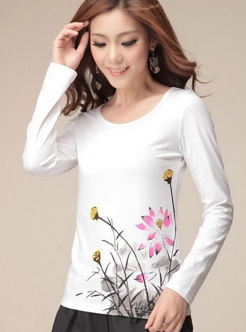 打底衫就是以简洁大方为主,因此白色款更加百搭,采用纯棉质地制作,纯白的打底衫既舒适,又容易与外套组合。如山水画一般的印花,片片荷花粉的娇艳,色彩或浓或淡,文艺气质凸显。