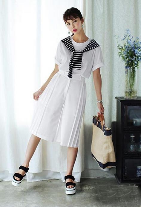 一身白色系装扮,看着就很凉爽。短袖T恤与阔腿裤的造型,将条纹衫系在肩膀上,迎面而来的海军风,感受夏季凉爽气息,十分有型的搭配。