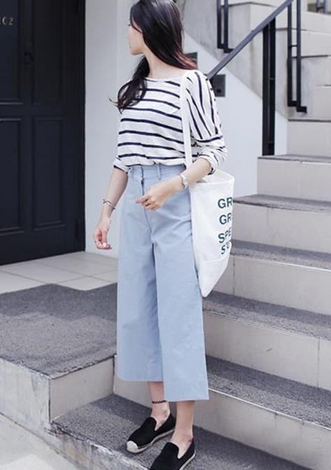 蓝白条纹长袖T恤搭配 浅蓝色阔腿裤,迷人养眼的装扮,清新时髦,透着温柔恬静的气质,搭配黑色平底鞋,背着休闲手袋,大方利落。