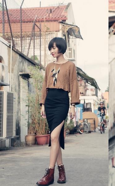 黑色半身裙搭配三:驼色短款T恤+黑色开叉高腰包臀裙+棕色短靴,十分文艺气质的休闲搭配,开叉露腿展露小性感。