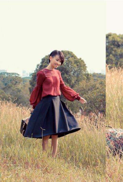黑色半身裙搭配四:枣红色灯笼袖衬衫+黑色半身裙+印花手提包,具有复古气质的一款裙装搭配。