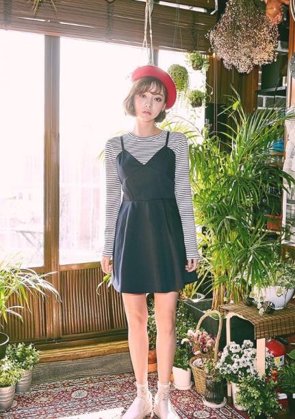 条纹T恤搭配吊带连衣裙来穿,把性感吊带穿出了邻家乖乖女的味道。文艺范儿的宝宝们可以尝试尝试哦。
