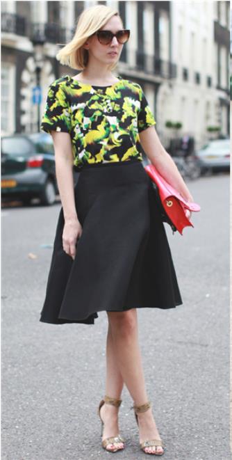 纯色半身裙搭配印花上衣能够让印花更加吸睛,而黑色的最佳配色之一就是绿色,别看造型很简单,处处是心机~~