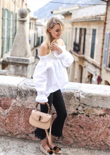 白衬衫搭配喇叭裤很有复古feel,而今年流行的毛边微喇牛仔裤搭配起来更加减龄,一字领白衬衫十分干净迷人,非常适合初秋尝试。